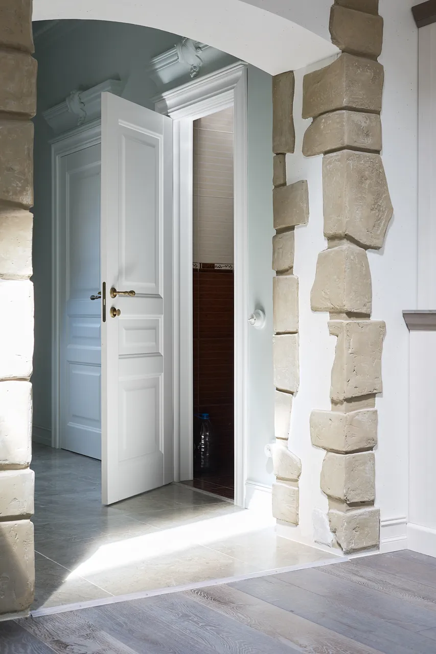 Гостиная превратилась в уникальное пространство, где "замок" героев словно сложен из камня. Местами "обвалившаяся" штукатурка обнажила каменный межкомнатный портал, добавляя интерьеру аутентичности и драматизма. Этот необычный подход позволил связать гостиную с остальными комнатами дома, создавая целостную историю.